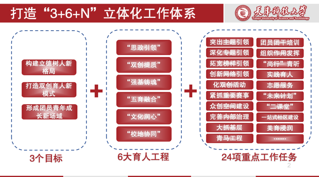 2025 年,校团委深入贯彻落实学校第四次党代会精神,锚定高水平研究型大学建设目标,紧扣高质量内涵发展 "先锋计划", 以高站位谋篇布局、以实干劲推动发展、以真成效诠释担当,奏响青春强音,生动讲述天科青年奋进故事。现邀您一同见证: 一、召开九届委员会全体(扩大)会议,传达学校第四次党代会精神,在团员青年中形成学习热议党代会精神热潮 1月13日,校团委在河西校区主楼第二会议室召开九届委员会第二十二次全体(扩大)会议,深入学习贯彻学校第四次党代会精神。校团委第九届委员会全体委员、基层团委书记参加会议。本次会议是校团委深入学习学校第四次党代会精神的具体举措和务实行动,是共青团围绕中心、服务大局的主动探索和具体实践。校团委将按照党委统一部署,聚焦主责主业、发挥优势特点,持续激发团组织活力和团员青年力量,围绕第四次党代会宏伟蓝图勇担使命、攻坚突破、真抓实干、善作善成,团结引领广大团员青年为建设高水平研究型大学奋楫笃行、挺膺担当。 二、圆满完成 2025 天津达沃斯论坛保障任务,积极有序推进服务上合峰会筹备工作 3月20日起,校团委面向全校天科青年招募上海合作组织峰会、2025夏季达沃斯论坛志愿者。经过层层选拔,从全校1874名报名学生中遴选出100名上合峰会志愿者,其中50名志愿者已完成达沃斯论坛保障的各项任务。未来,校团委将继续积极有序推进服务上合峰会筹备工作,推动我校志愿服务工作高质量内涵发展贡献力量。 三、开展第二届“我们的节日”五四嘉年华系列活动 为纪念五四运动106周年,教育引导广大团员青年传承五四精神、矢志争做先锋,在五四青年节到来之际,我校启动第二届“我们的节日”五四嘉年华活动,为团员青年打造“1+5+25”的沉浸式节日体验。相关活动被中国日报网等主流媒体报道。 四、开展天津科技大学首届“十佳青年”评选活动 在"先锋计划"引领下,校团委面向全校团员青年开展十佳先锋青年评选展示活动,一起寻找崇德向善的追梦者、用脚步丈量祖国大地的实践者、科技创新的探路者、文艺实践的追光者,绘就天科青年榜样群像。引领天科青年共赴这场跨越时空的信仰之旅,赓续奋斗,强国有我! 五、举办第十八届“挑战杯”天津科技大学大学生课外学术科技作品竞赛 校团委举办第十八届“挑战杯”天津科技大学大学生课外学术科技作品竞赛共有1058个项目报名参加,学生6786人次,指导教师636名,数量再创新高。满额推荐36个项目参加市赛,获奖35项,获奖项目数量与天津大学、天津理工大学并列天津市第一,5个项目入围国赛。 六、完成“西部计划”“研究生支教团”选拔招募培训工作 学校团委自2025年2月启动西部计划的宣传招募工作。前期,通过召开专场宣讲会、专题工作部署会、在招聘会设置西部计划专题宣传展位等多种形式,统筹部署、统筹安排、统筹推进西部计划的各项工作。依托团属新媒体矩阵,持续推送西部计划宣传推文和历年西部计划志愿者的风采,累计阅读量1万+,不断扩大西部计划在学生中的知名度和影响力。今年西部计划志愿者报名人数累计达310余人,拟派出西部计划志愿者66人、研究生支教团志愿者6人,报名人数和派出人数均创历史新高,越来越多的科大青年主动选择到西部、到祖国需要的地方建功立业。 七、举办天津科技大学第二十届校园十大歌手比赛暨毕业季音乐节活动 6月12日晚,由校团委、校学生会联合举办的“锋声破晓 科韵华章”第二十届校园十大歌手决赛暨毕业季音乐节活动在滨海中校区体育场深情上演。校党委副书记安玉健,海河乳品有限公司党委书记、董事长邹旸一行,学校各部门各学院负责同志共同参加活动,8千余名师生欢聚体育场,现场氛围热烈而欢腾。 八、举办3·5“志愿嘉年华”活动 3月3日,校团委在滨海校区中院金禾广场举办“传承雷锋精神,争做时代新人”志愿嘉年华活动。引导学生深度挖掘志愿服务的精髓,激发学生投身志愿服务的热情,搭建校内的志愿者项目展示自我的舞台。活动现场围绕“专业助航”“文明传递”“温暖校园”三个板块设计20多个点位。活动受到人民日报、中国青年网、天津共青团、网易新闻等媒体报道。 九、召开第十五次学生代表大会、第六次研究生代表大会 6月21日,天津科技大学第十五次学生代表大会、第六次研究生代表大会在滨海校区言泉楼千人礼堂开幕。校党委副书记安玉健出席会议。天津市学联执行主席刘朔、天津大学学生会主席团成员车雨轩,党委学工部、党委研工部、校团委主要负责同志,学生会、研究生会秘书长,各学院党委和团委负责同志参加会议。 十、打造“3+6+N”立体化工作体系 学校共青团立足教育强国和教育现代化的战略格局,着眼于学校高水平研究型大学建设,紧扣高质量内涵发展“先锋计划”,紧紧围绕立德树人根本任务和人才培养重点工作,主动投入 “三全育人”“五育并举”工作格局,打造了“3+6+N”立体化工作体系,探索形成了共青团高质量内涵发展的“科大方案”。 |