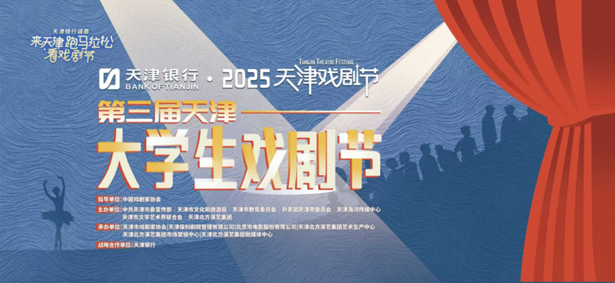 当青春与舞台碰撞 当创意与热爱交织 第三届天津大学生戏剧节 终评竞演拉开帷幕! 线上精品火热进行中! 由中国戏剧家协会指导,中共天津市委宣传部、天津市文化和旅游局、天津市教育委员会、共青团天津市委员会、天津海河传媒中心、天津市文学艺术界联合会、天津北方演艺集团联合主办,天津银行全程冠名支持的天津银行·2025天津戏剧节暨第三届天津大学生戏剧节,目前正火热进行中。